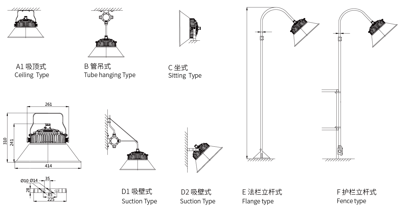 安裝方式:可根據(jù)需求采用吸頂、吸壁、彎桿等多種安裝方式,滿足低頂、平臺、高頂、高棚等多種場所作為固定照明使用,產(chǎn)品采用抗震材料和減震結(jié)構(gòu),尤其適合應(yīng)用在各種高頻率、強震動場所。